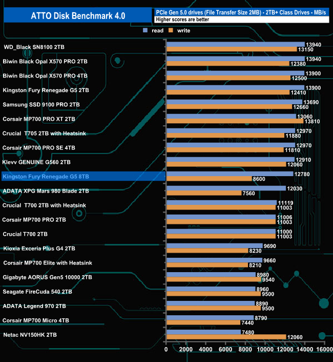 Using this more up-to-date version of ATTO, we could confirm the official Sequential ratings with a read test result of 14,900MB/s and 14,190MB/s for writes.