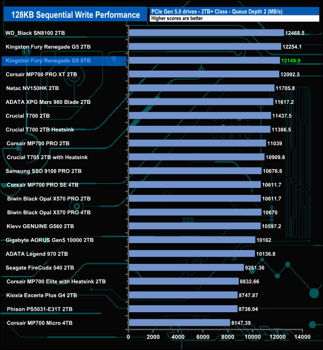 At QD1, the 8TB version of the Fury Renegade G5 is slower than the 2TB version. At QD2 and QD4, the difference between them narrows, but at QD32, the positions swapped, with the larger drive faster.