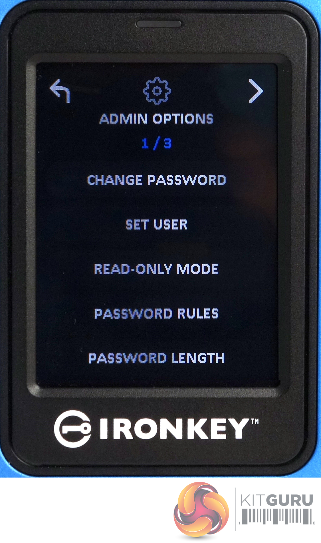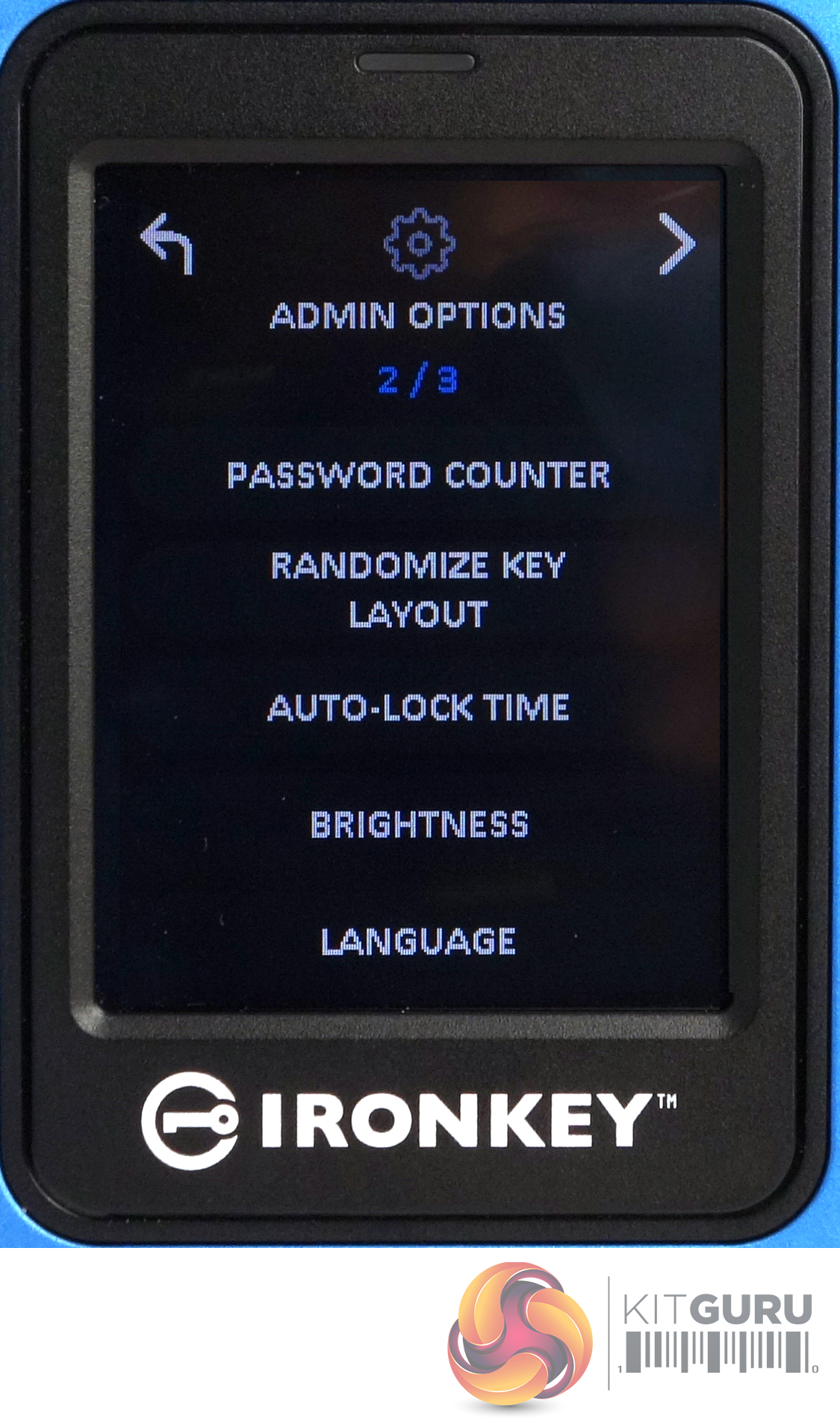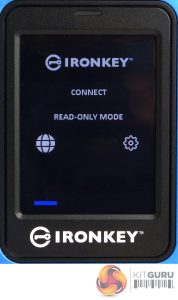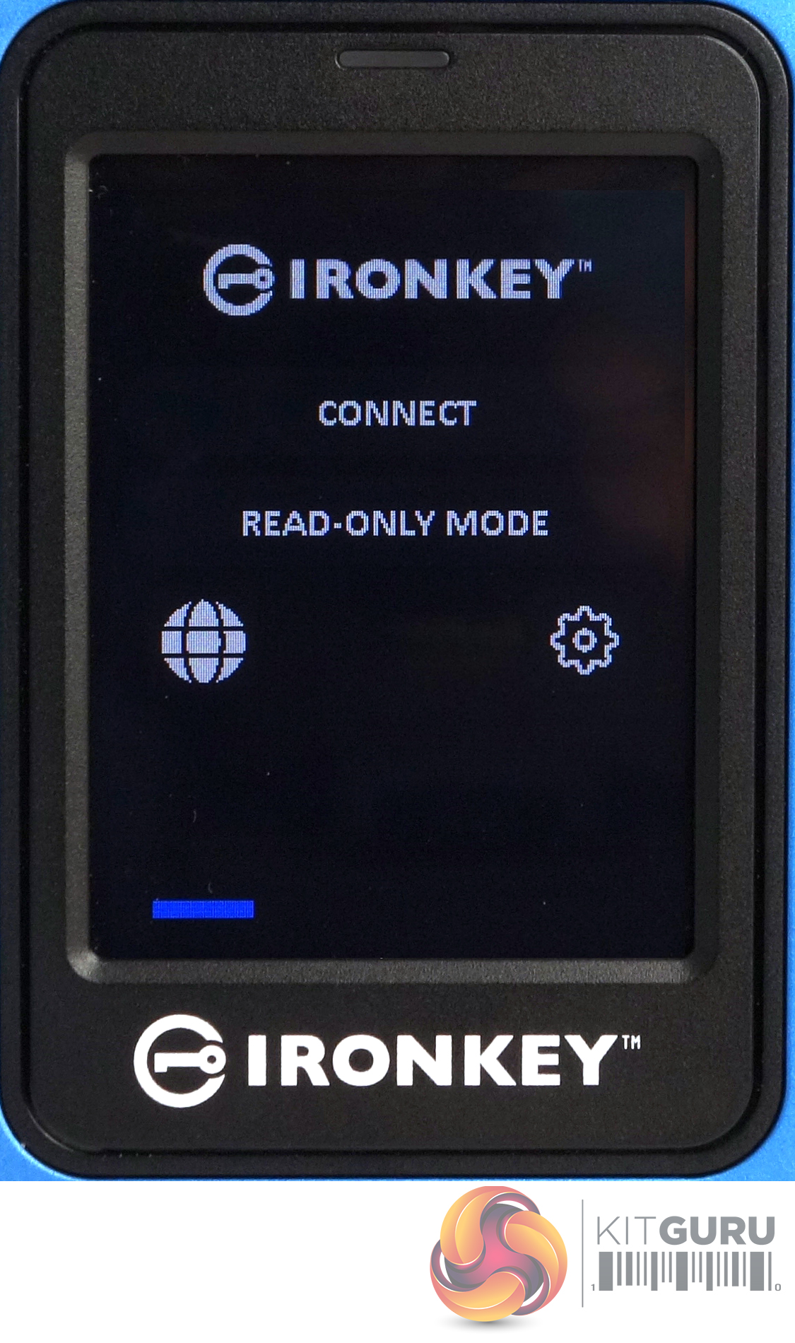 There are four options; Connect, which connects the drive to the system, Read-only connects the drive in read-only mode (a defence against malware if the drive is plugged into an unknown system). Pressing the Globe icon takes you to the language section (four languages are supported English, French, German and Spanish) and finally, the gear icon takes you to the Admin page.