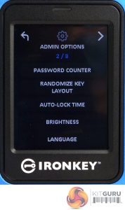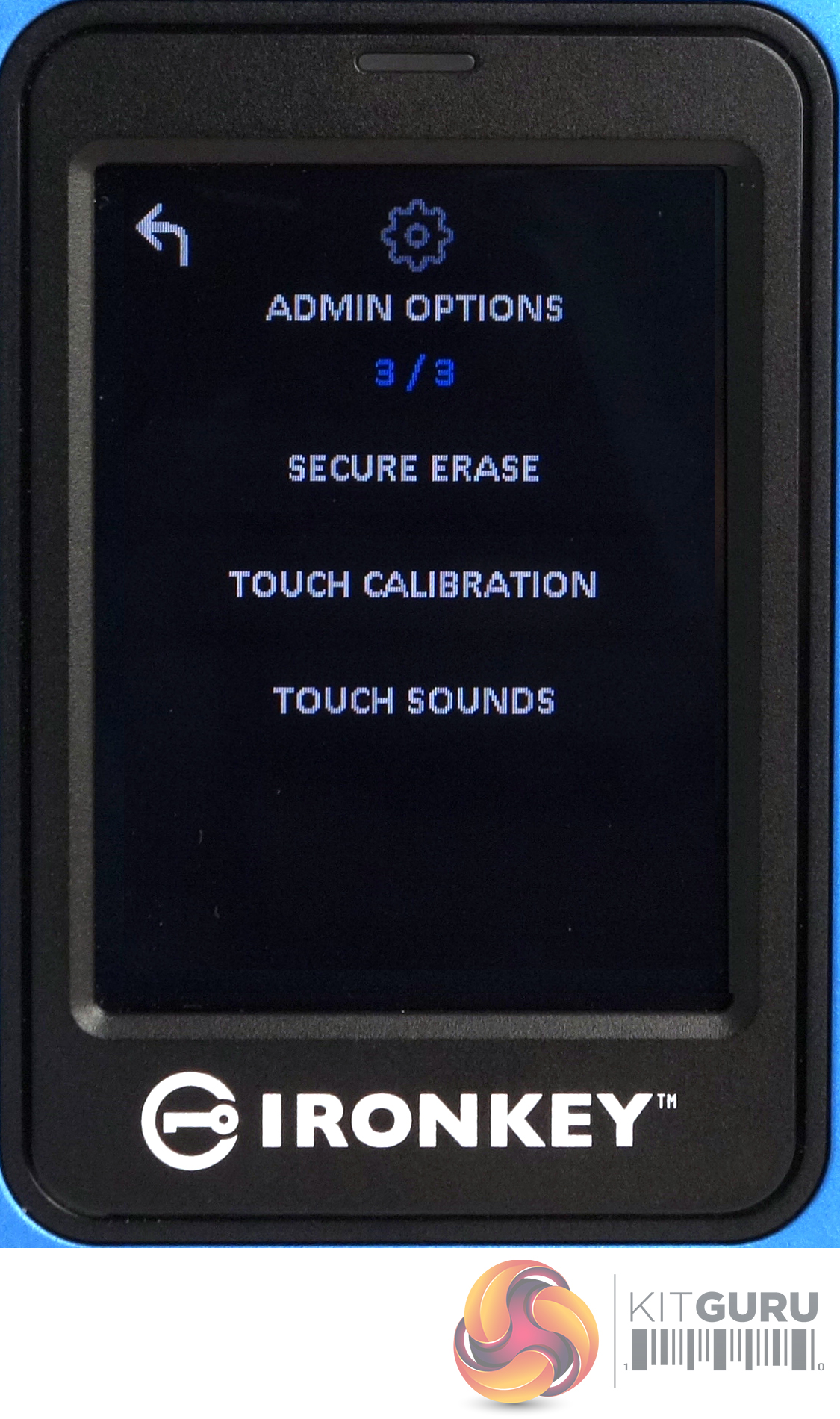 Menu two has the password counter, where you can set the maximum number of password retries (the default is 15, the maximum 30). For improved security, you can mix up the number and alphabet keyboard rows. In this menu, you can also set the time length before the drive locks. In the third menu, there is Secure Erase, Touch calibration and touch sound options.
