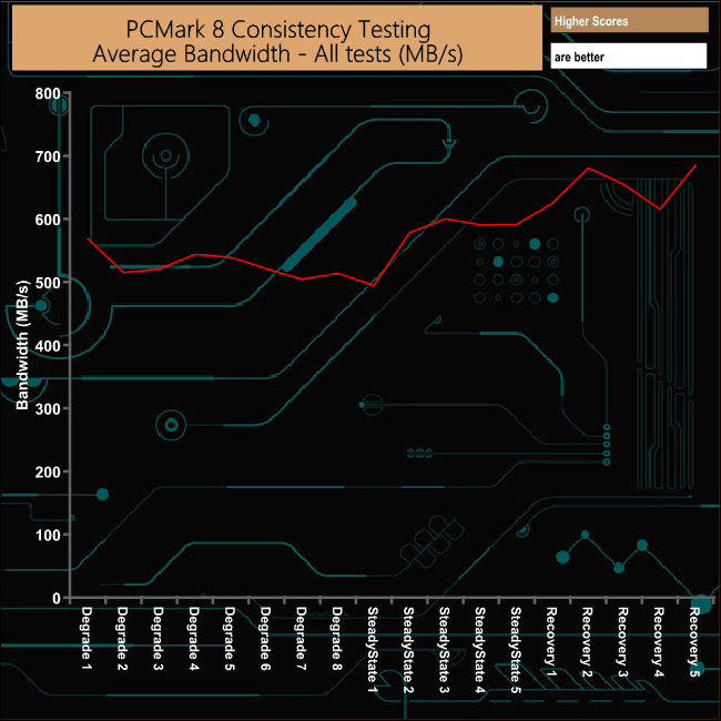The KC2000 handles the rigours of PCMark 8's Consistency Test rather well. There are no major drops performance as the test progresses although the drives recovery isn't exactly consistent,