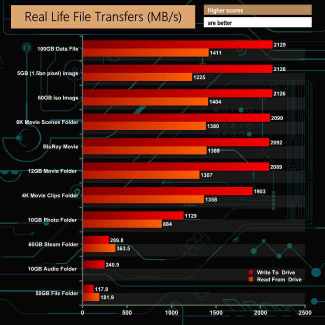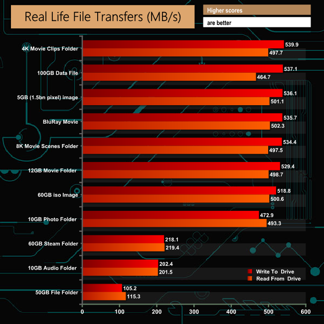 The drive handles large file sizes a lot more effectively than smaller ones, as can be seen by the 500MB/s+ figures for the tests made up of larger files (ISO image, 4K movie clips and 8K Movie scenes etc).