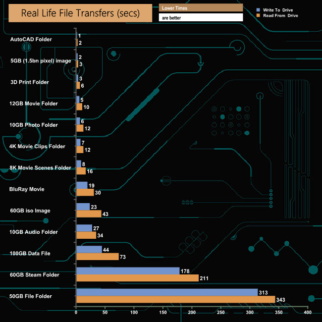 To get a measure of how much faster PCIe NVMe drives are than standard SATA SSD' we use the same files but transfer to and from a 512GB Kioxia OCZ RD400: