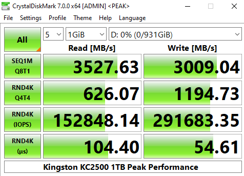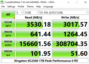 Looking at the Peak Performance results for Sequential read/write performance we could confirm the official Sequential read/write figures of up to 3,500MB/s and 2,900MB/s respectively with the review drive showing reads at 3,527MB/s and 3,009MB/s for writes under testing.