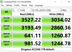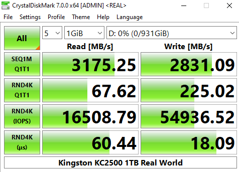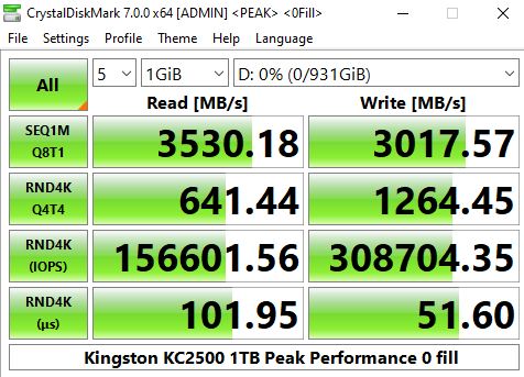 At a deep queue depth of 32, Kingston’s KC2500 sees improvements in performance for both reads and writes over the previous KC2000 drive. Looking at the two CrystalDiskMark result screens it appears that the controller doesn't have a preference for the type of data it's being asked to work with.