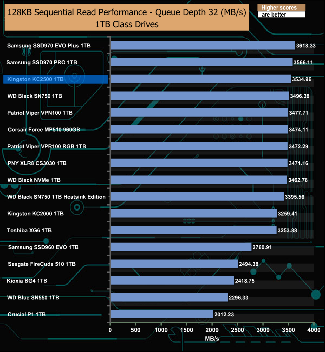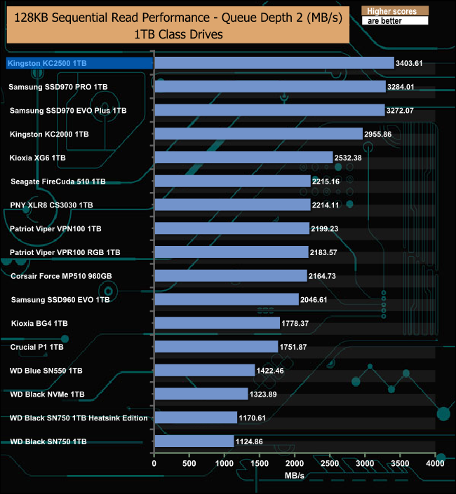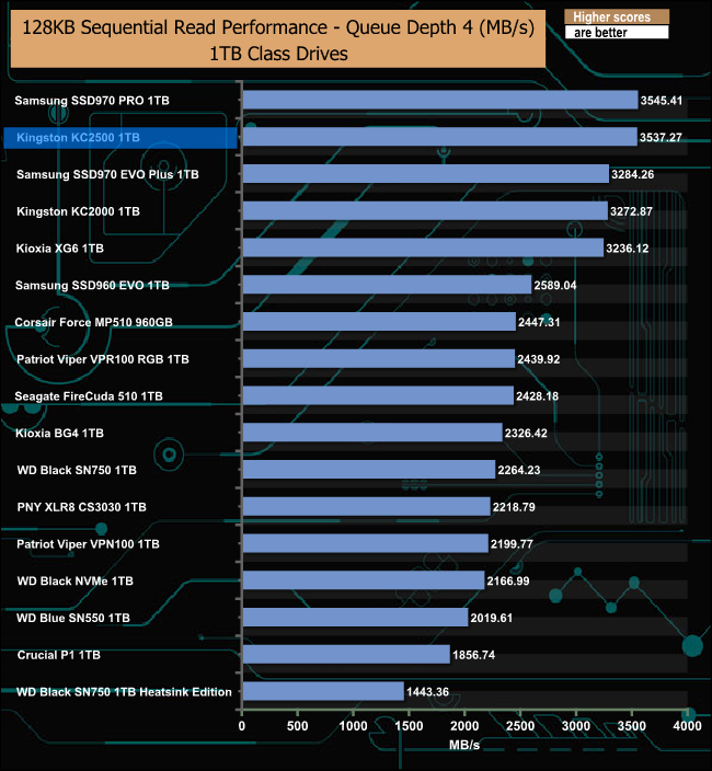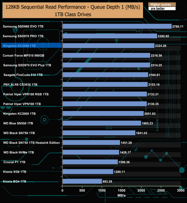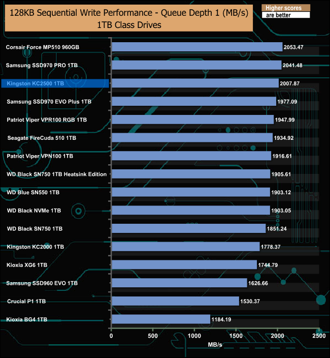 The KC2500 performs very strongly throughout the tested queue depths, at QD2 it's the fastest 1TB class M.2 consumer drive we've tested to date.