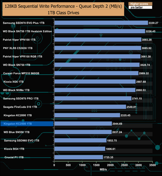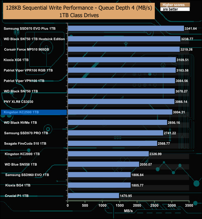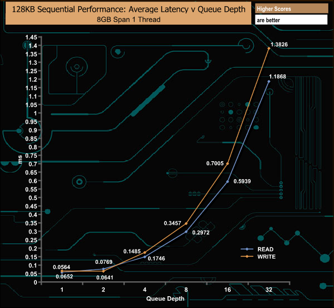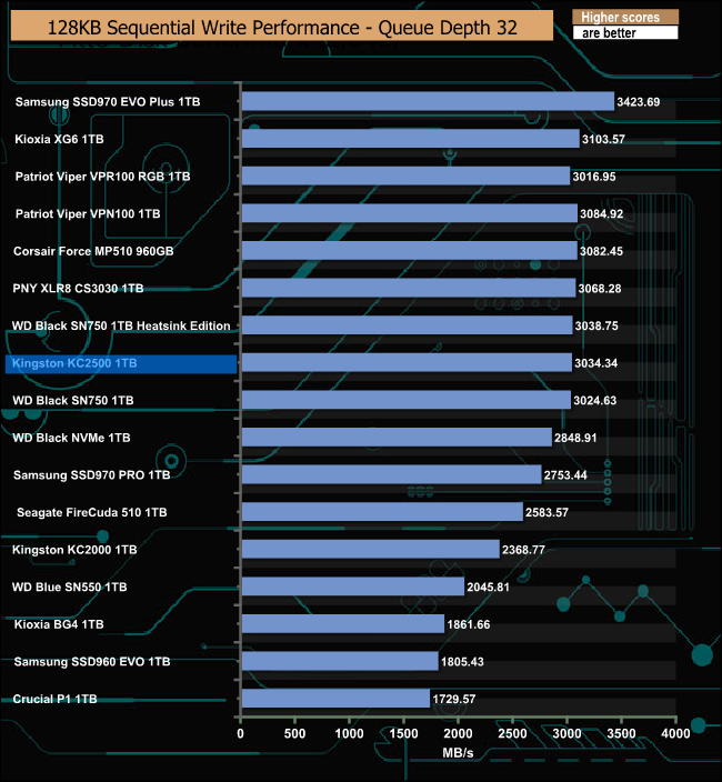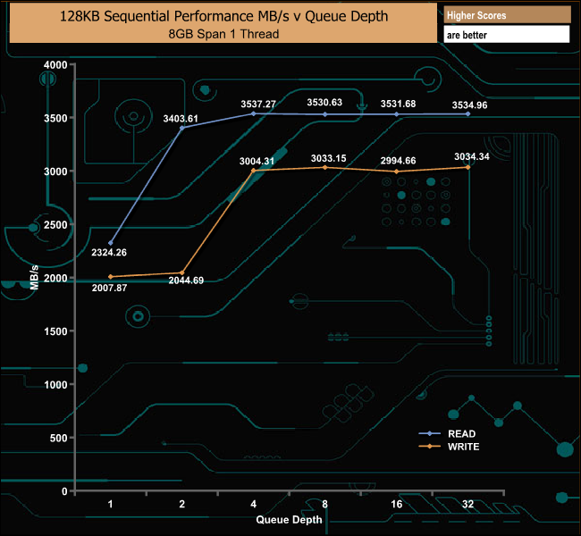 The Sequential write performance isn't as strong as the read in comparison to the other tested drives. The best performance comes at QD1, after which it slips back down the charts. Indeed at QD2 it's slower than the KC2000 but it recovers to outperform the previous drive at QDs 4 and 32