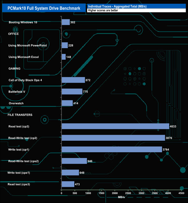 The PCMark 10 Full System Drive Benchmark uses a wide-ranging set of real-world traces from popular applications and common tasks to fully test the performance of the fastest modern drives. The benchmark is designed to measure the performance of fast system drives using the SATA bus at the low end and devices connected via PCI Express at the high end.