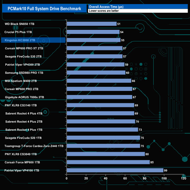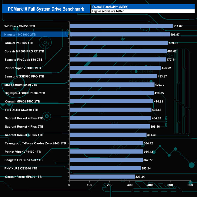 For the overall bandwidth result, the Kingston KC3000 test result of 496.57MB/s sees the drive slotting into second place in the results table behind WD's Black SN850 drive.