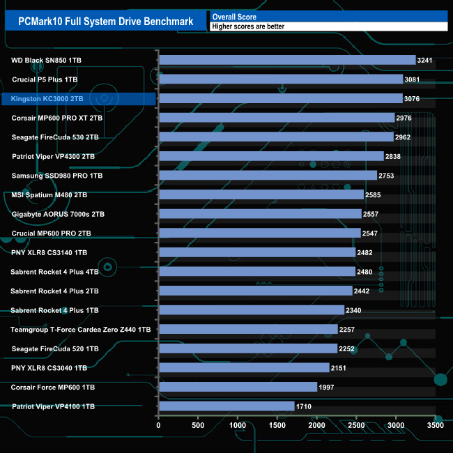 Kingston's KC3000 drive handled the rigours of the PCMark10 Full System Drive benchmark very well producing some strong figures from the test traces. It averaged 245MB/s for the six Adobe startup tests and 469MB/s for the five using Adobe test traces helped in no small part by the 1,071MB/s result for the Adobe Photoshop (heavy use) trace.