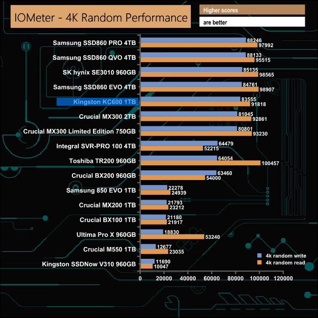 When it comes to 4K random performance, Kingston rate the 1TB drive as up to 90,000 IOPS for reads and up to 80,000 IOPS for writes. When tested with our IOMeter 4K random test, the review drive confirmed the official ratings with reads at 91,818 IOPS and writes at 83,555 IOPS