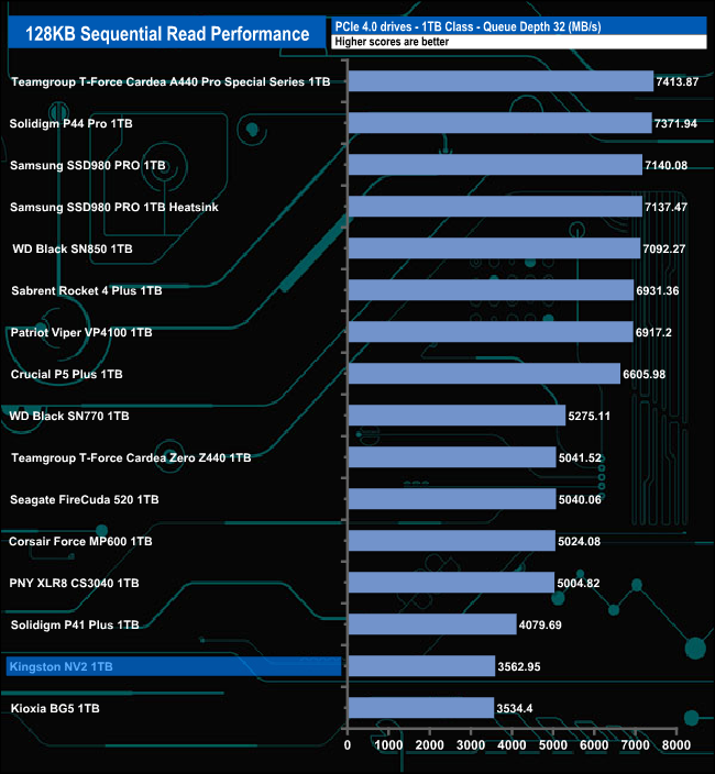 The NV2's best performance in the queue depth tests came at QD2 where its result of 2,766MB/s puts it in the top half of the 1TB class consumer drives we've tested to date. As the QD deepens the drive slips down the chart.