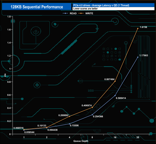 In comparison to the Sequential read QD results when it comes to Sequential writes, the drive stays firmly on the bottom of the performance graph through all the tested queue depths.