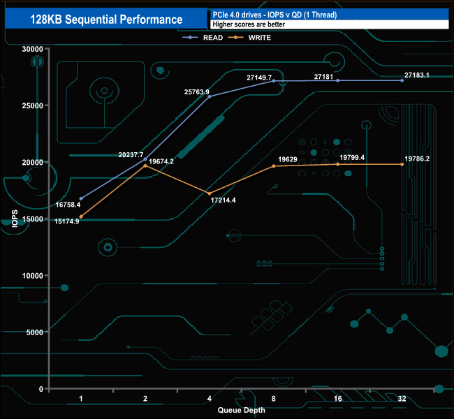 We used CrystalDiskMark 8‘s custom settings to test the Sequential read and write performance of the drive through a range of queue depths. The setup for the tests is listed below.