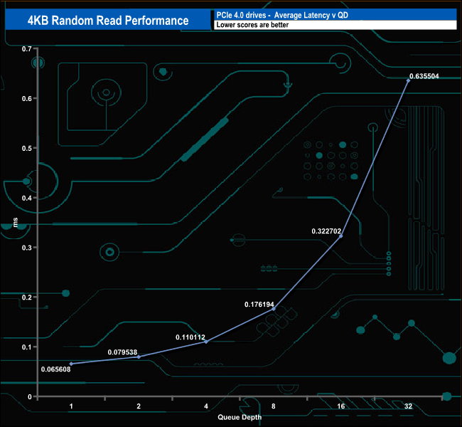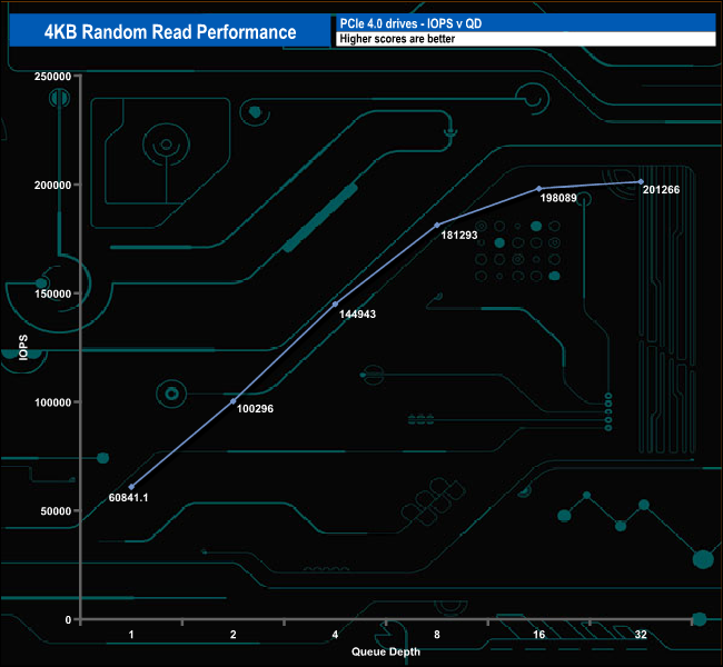 We used CrystalDiskMark 8‘s custom settings to test the 4K random read performance of the drive through a range of queue depths. The setup for the tests is listed below.