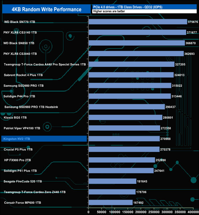 When it came to random writes, the best figure we saw came at QD32 at 270,988 IOPS (1,109.97MB/s). At QD8 the performance drops off (232,079 IOPS) but recovers back by QD16.