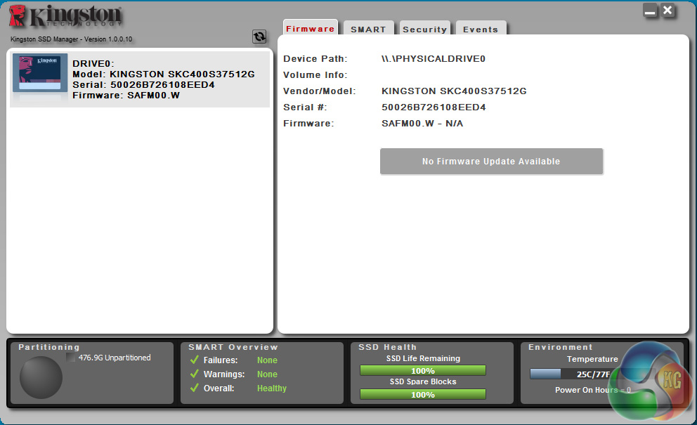 Kingston's SSD management software is called SSD Manager and while at first glance it doesn't look as intricate as Samsung's Magician software, for example, it does cover most of the basics. It displays drive partition information, a SMART overview, SSD Health (including how many spare blocks there are) and the temperature of the drive.