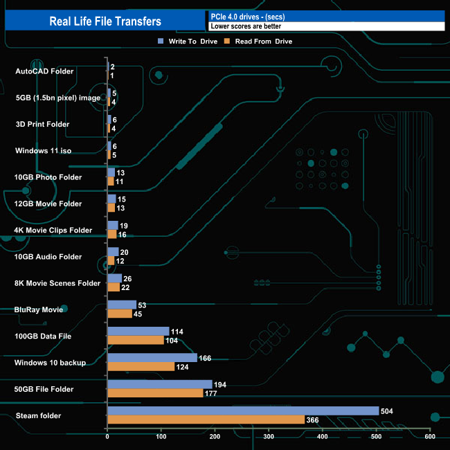To test the real-life performance of a drive we use a mix of folder/file types and by using the FastCopy utility (which gives a time as well as MB/s result) we record the performance of drive reading from & writing to a 2TB Seagate FireCuda 510.