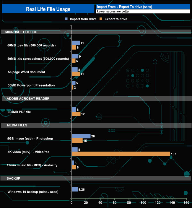 We also tested the time it took to import and export a mix of files from/to the XS1000 into various programs.
