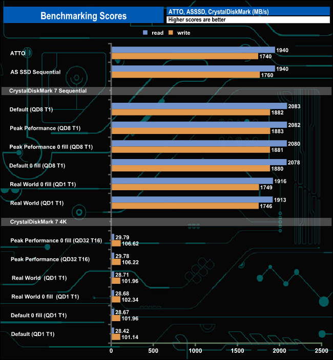 AS SSD is a great free tool designed just for benching Solid State Drives. It performs an array of sequential read and write tests, as well as random read and write tests with sequential access times over a portion of the drive. AS SSD includes a sub suite of benchmarks with various file pattern algorithms but this is difficult in trying to judge accurate performance figures.