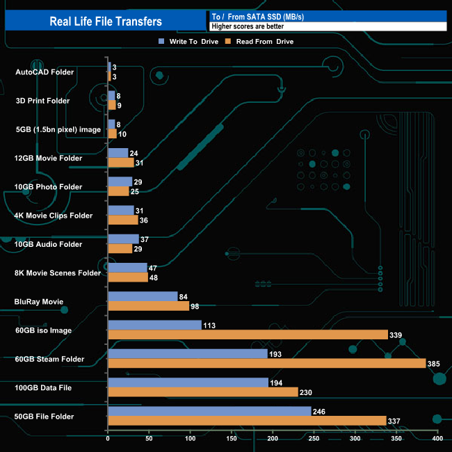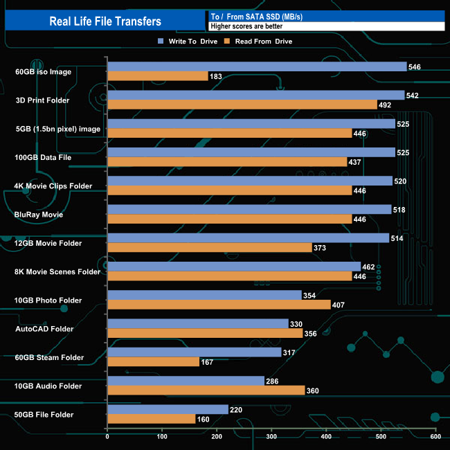 To test the real-life performance of a drive we use a mix of folder/file types and by using the FastCopy utility (which gives a time as well as MB/s result) we record the performance of drive reading from & writing to a 256GB Samsung SSD850 PRO.