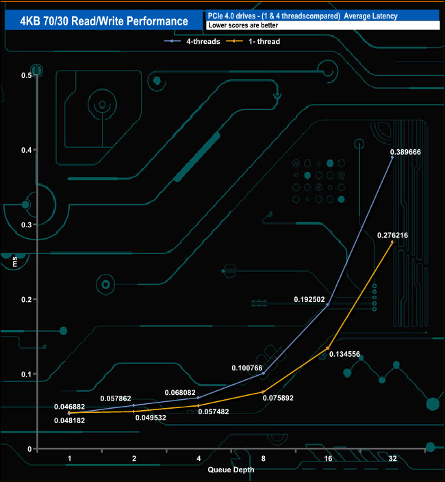 We used CrystalDiskMark 8’s custom settings to test the 4K 70/30 mixed read/write performance of the drive through a range of queue depths using a single thread and four threads.