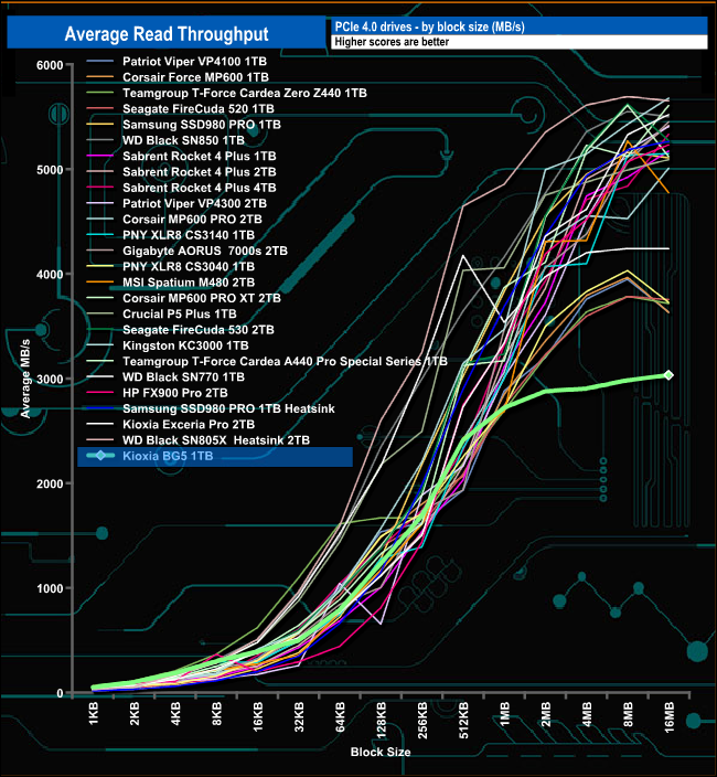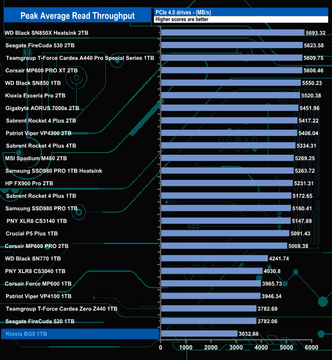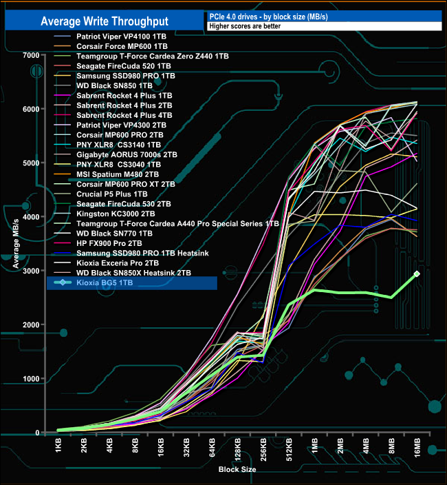 In our read throughput test, the drive peaks at the end of the test (16MB block mark) with a score of 3,032.88MB/s a fair bit behind the official read rating of 3,500MB/s and it sees the drive at the bottom of the results chart.