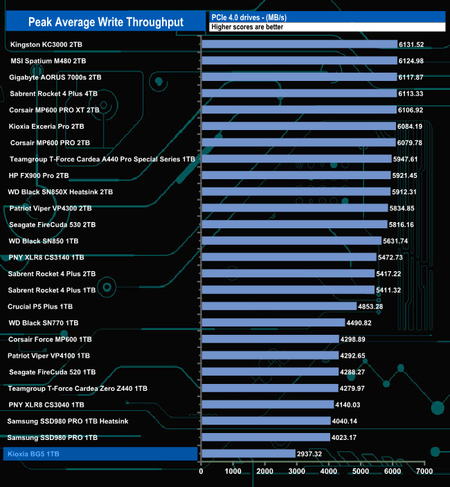 As with the read throughput test, the write test sees the drive peak at the end of the test run with a test figure of 2,937.32MB/s which, unlike the read figure, confirms the official write rating of 2,900MB/s but as with the read performance, that figure sees the drive propping up the table.