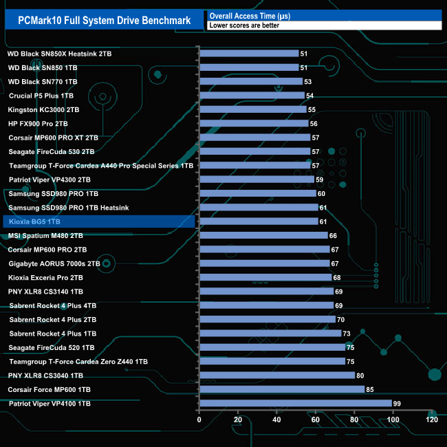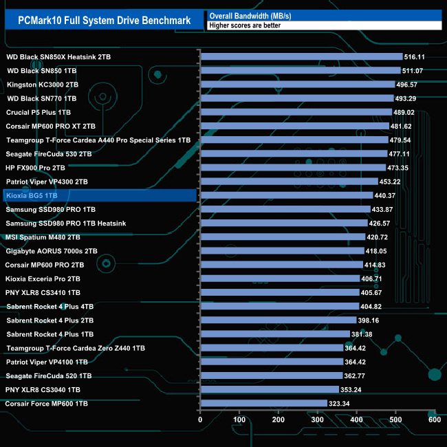 The best result from the 1TB Kioxia BG5 in PCMark10’s Full System Drive Benchmark Adobe test traces was the 872MB/s for the Heavy Use Adobe Photoshop trace while the best result in the gaming test traces was the 756MB/s from the Battlefield V trace. The file transfer tests also produced a good cp1 (write test) figure of 2,554MB/s backed up by the 1,869MB/s for the cp2 read/write and 1,650MB/s for the cp3 (read test) test traces.