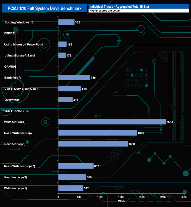 The PCMark 10 Full System Drive Benchmark uses a wide-ranging set of real-world traces from popular applications and common tasks to fully test the performance of the fastest modern drives. The benchmark is designed to measure the performance of fast system drives using the SATA bus at the low end and devices connected via PCI Express at the high end.