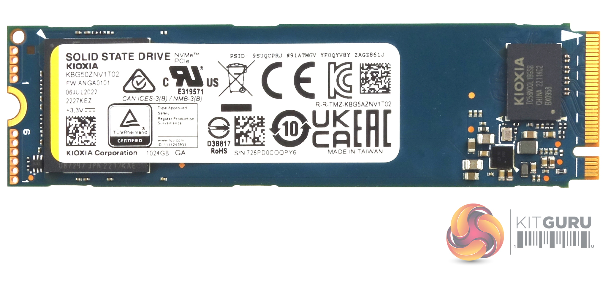 Under the product sticker is a single 1TB package of Kioxia's BiCS5 112-layer TLC 3D NAND (coded TH58LKT3X25BAEG). There's a lot of empty real estate between the NAND package and the tiny Kioxia controller, labelled TC58NCOL1BGSB at the other end of the board.