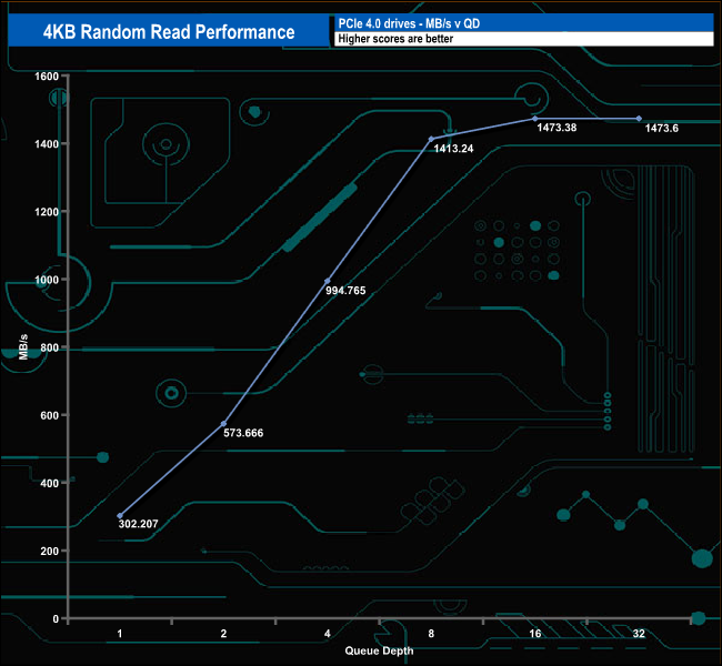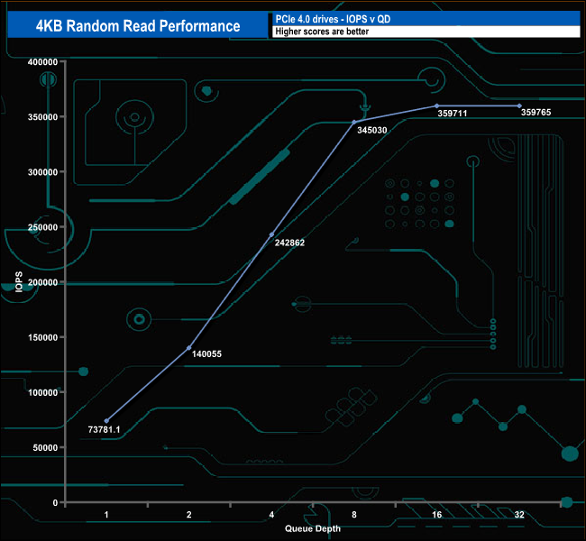 We used CrystalDiskMark 8‘s custom settings to test the 4K random read performance of the drive through a range of queue depths. The setup for the tests is listed below.