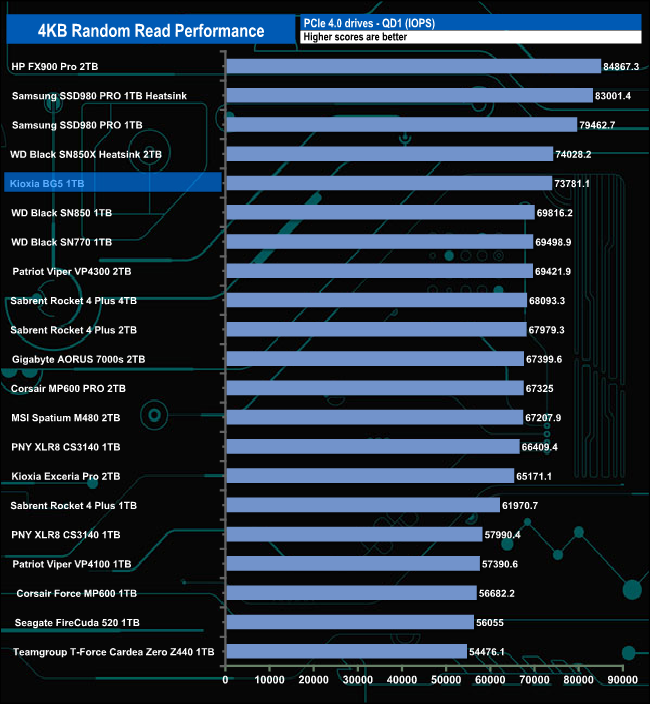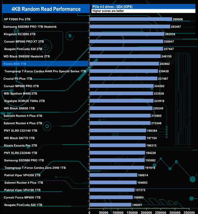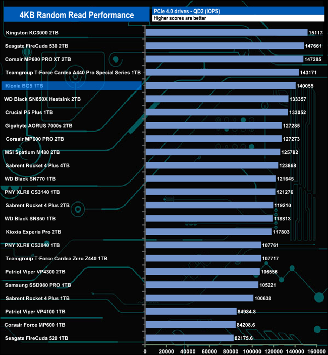 At QD 1 and 2, the BG5 sits in the top five of the drives we have tested. As the queue depth deepens the drive starts to drop down the table. By QD32 it's in the bottom half of our results chart.