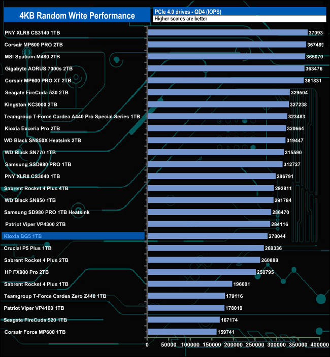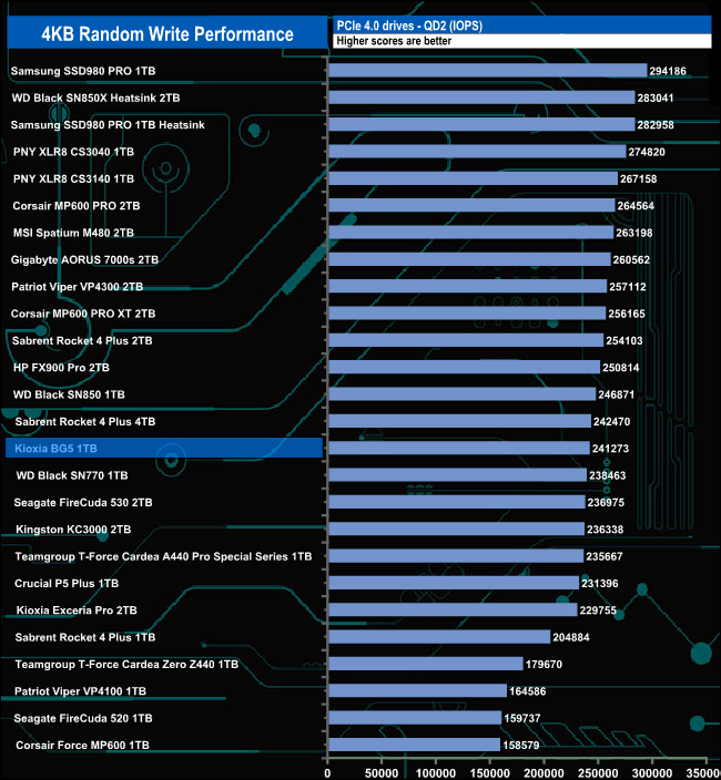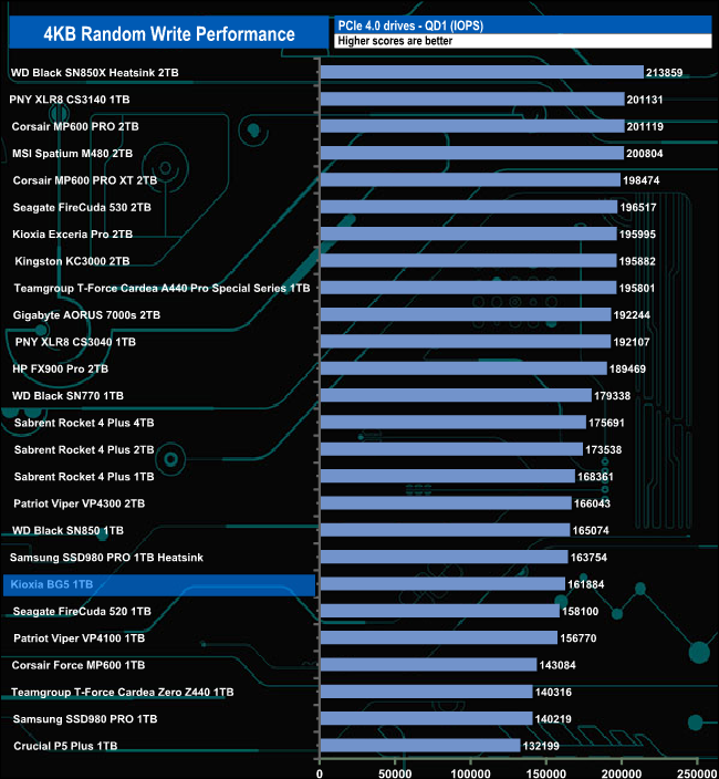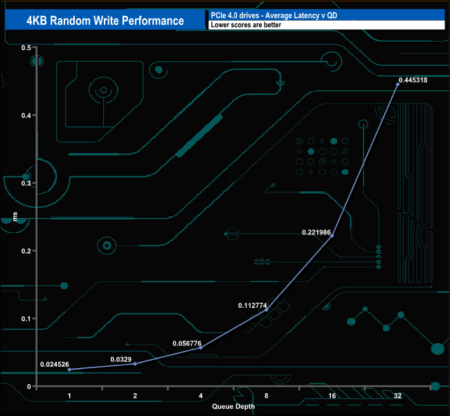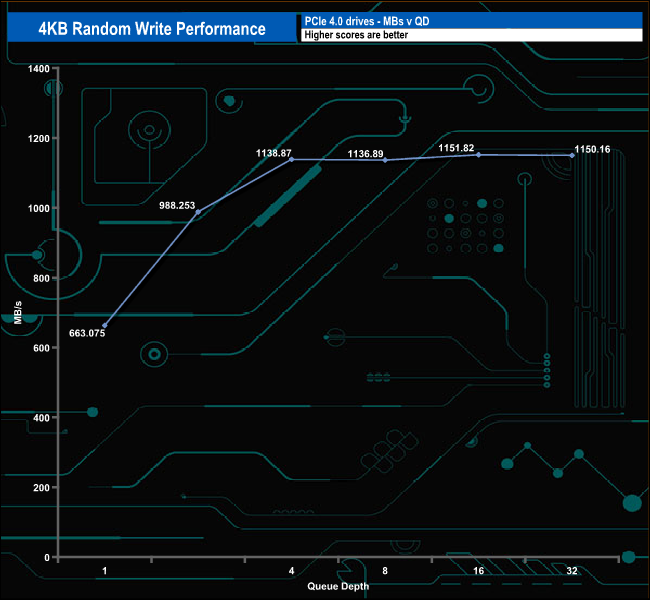 We used CrystalDiskMark 8‘s custom settings to test the 4K random write performance of the drive through a range of queue depths. The setup for the tests is listed below.