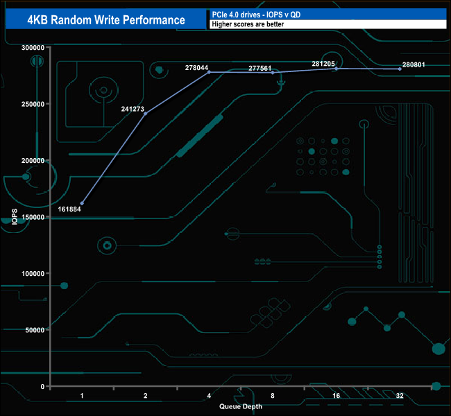 With our 4-threaded random write tests, the best result we saw from the drive was 281,205 IOPS at QD16, with the performance dropping back to 280,801 IOPS at the end of the test at QD32, both figures nowhere near the official maximum rating of 450,000 IOPS.