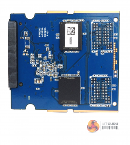 One side of the PCB has two packages of BiCS 3D TLC NAND (coded TH58TFT1T23BS8) while the other side of the board holds another two NAND packages and the tiny Toshiba (TC58NC1010GSB) controller. Details on the controller are pretty hard to find. The controller has a thermal pad stuck to it to wick away the heat from the controller into the drives enclosure. One thing to note is that the drive is a DRAM free design.