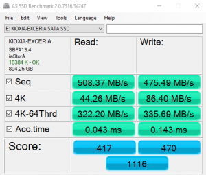 The Kioxia Exceria's performance in the AS-SSD benchmark is a little slower than the 960GB version of the TR200 we reviewed.