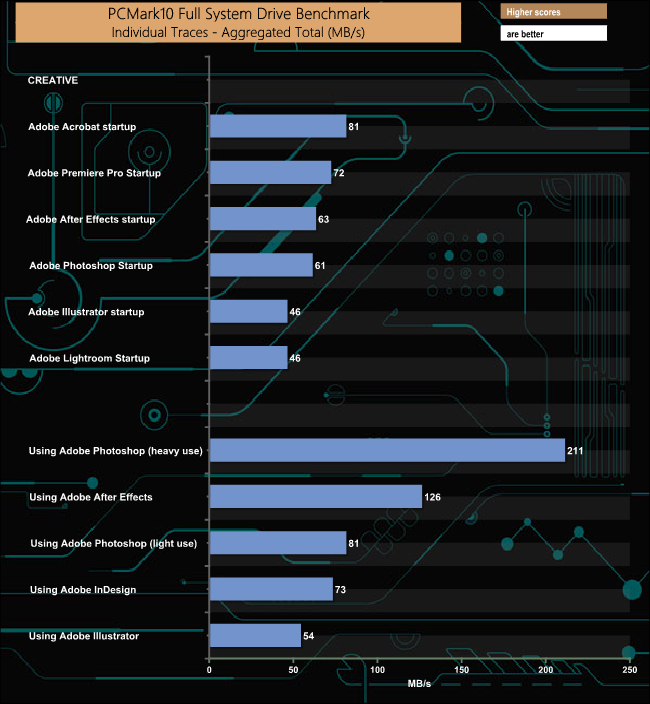 The PCMark 10 Full System Drive Benchmark uses a wide-ranging set of real-world traces from popular applications and common tasks to fully test the performance of the fastest modern drives. The benchmark is designed to measure the performance of fast system drives using the SATA bus at the low end and devices connected via PCI Express at the high end.