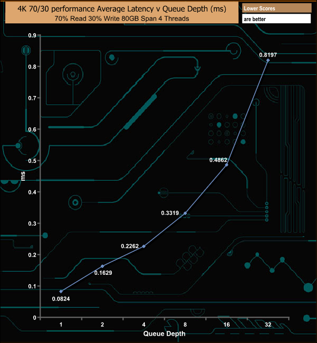 The 1TB Kioxia Exceria performs pretty well in our mixed read/write test, topping out at 645.25MB/s (157,533 IOPS) at a QD of 32.