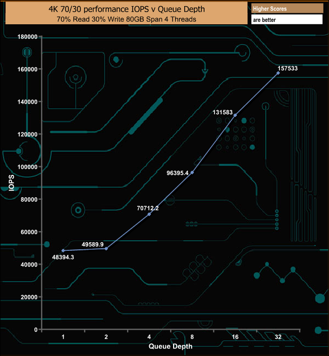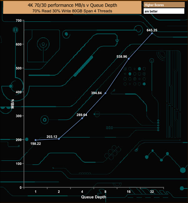 The 1TB Kioxia Exceria performs pretty well in our mixed read/write test, topping out at 645.25MB/s (157,533 IOPS) at a QD of 32.