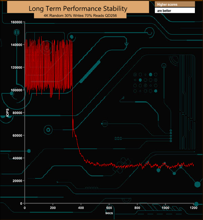 For the long term performance stability test, we set the drive up to run a 20-minute 4K random test with a 30% write, 70% read split, at a Queue Depth of 256 over the entire disk. The Kioxia Exceria NVMe 1TB drive averaged 59,112 IOPS for the test with a performance stability of 41% which is decent enough for a mainstream drive.