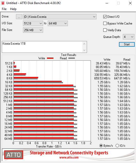 Kioxia rate the Sequential read/write performance of the drive as up to 1,700MB/s and 1,600MB/s respectively. We could confirm both figures under testing with reads of 1,630MB/s and writes of 1,570MB/s using the ATTO benchmark.