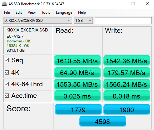 In the more stringent AS-SSD test, the Exceria NVMe performs pretty well with decent read and write scores.