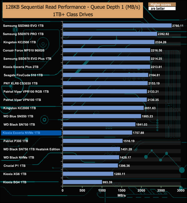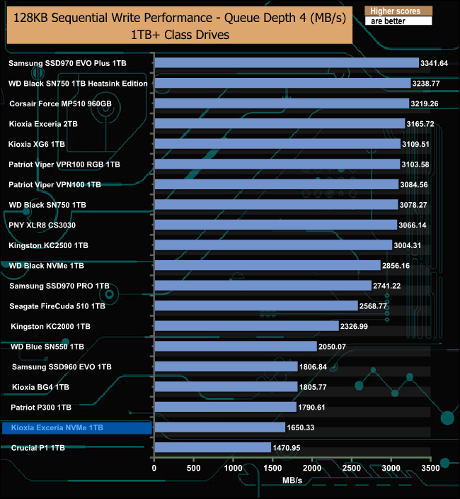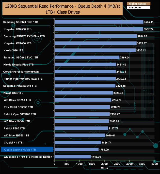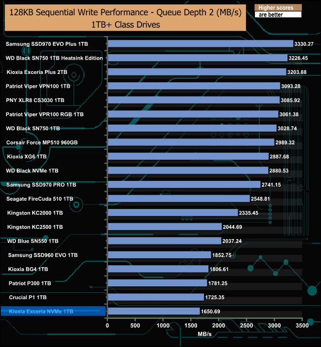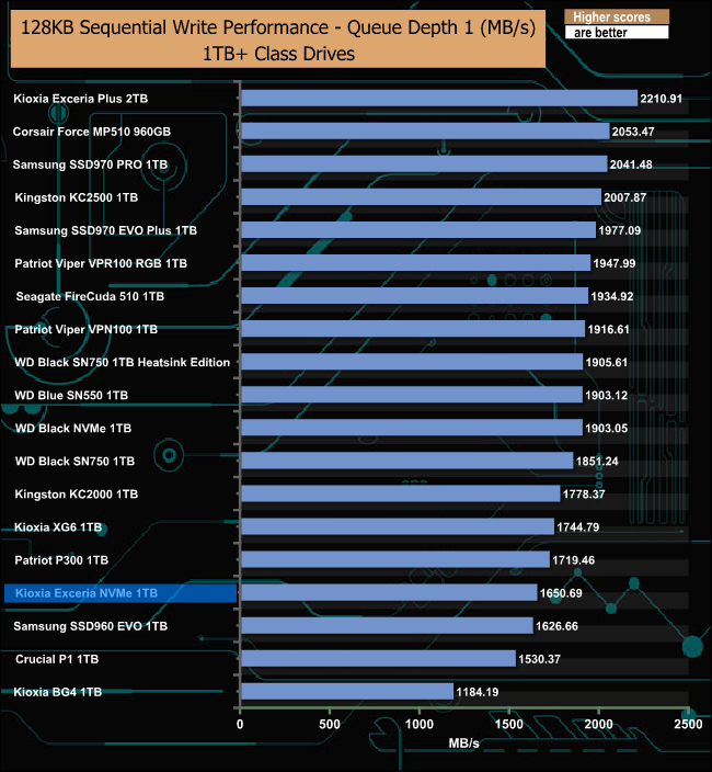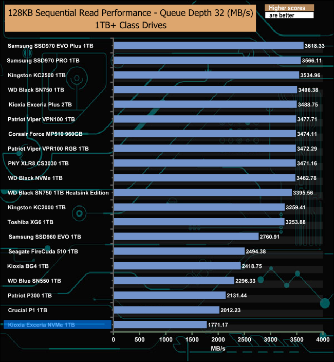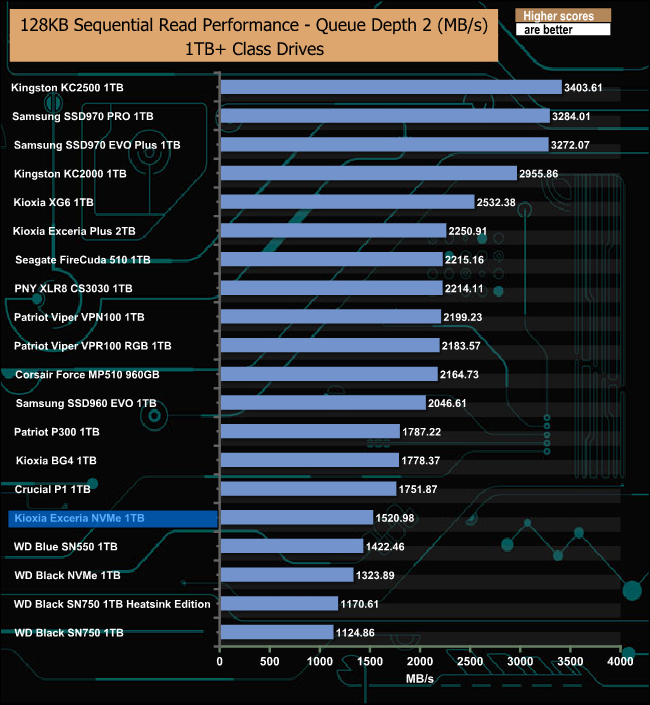 The Sequential read performance of the Exceria NVMe holds up quite well at QD's 1 and 2 but falls away as the queue depth deepens.
