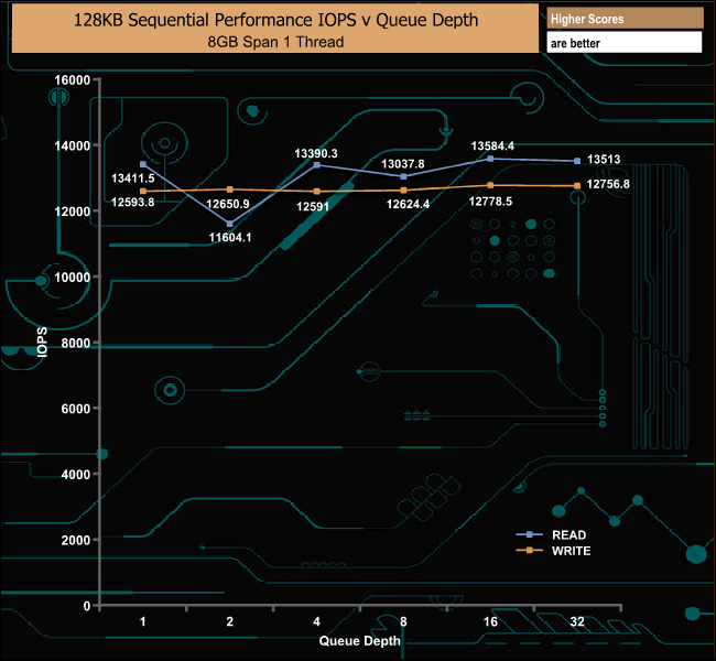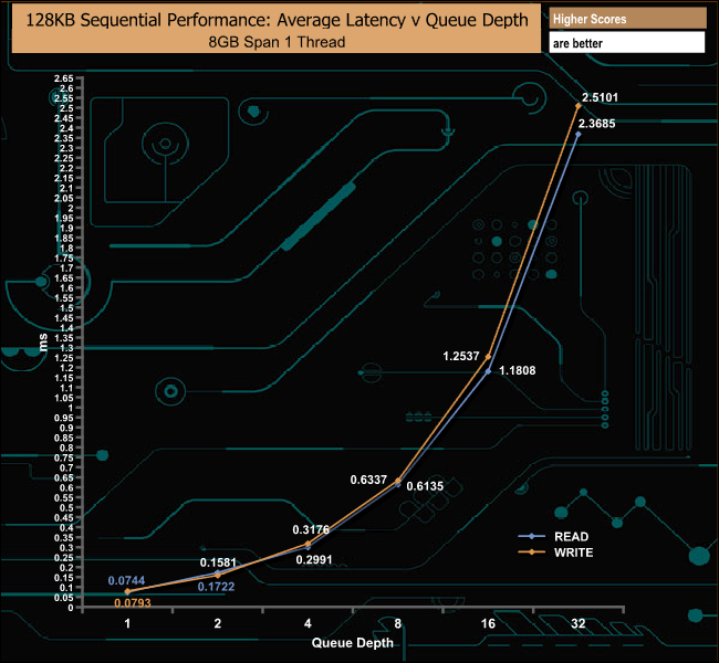 Even though the Sequential write performance isn't as strong as the reads, it is pretty consistent through the tested queue depths.