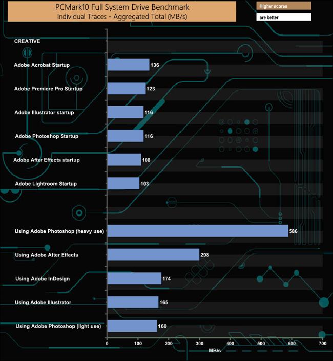 The best performance in the creative group of tests was the 586MB/s from the Adobe Photoshop heavy use test trace.