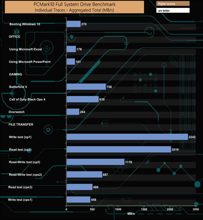 The PCMark 10 Full System Drive Benchmark uses a wide-ranging set of real-world traces from popular applications and common tasks to fully test the performance of the fastest modern drives. The benchmark is designed to measure the performance of fast system drives using the SATA bus at the low end and devices connected via PCI Express at the high end.