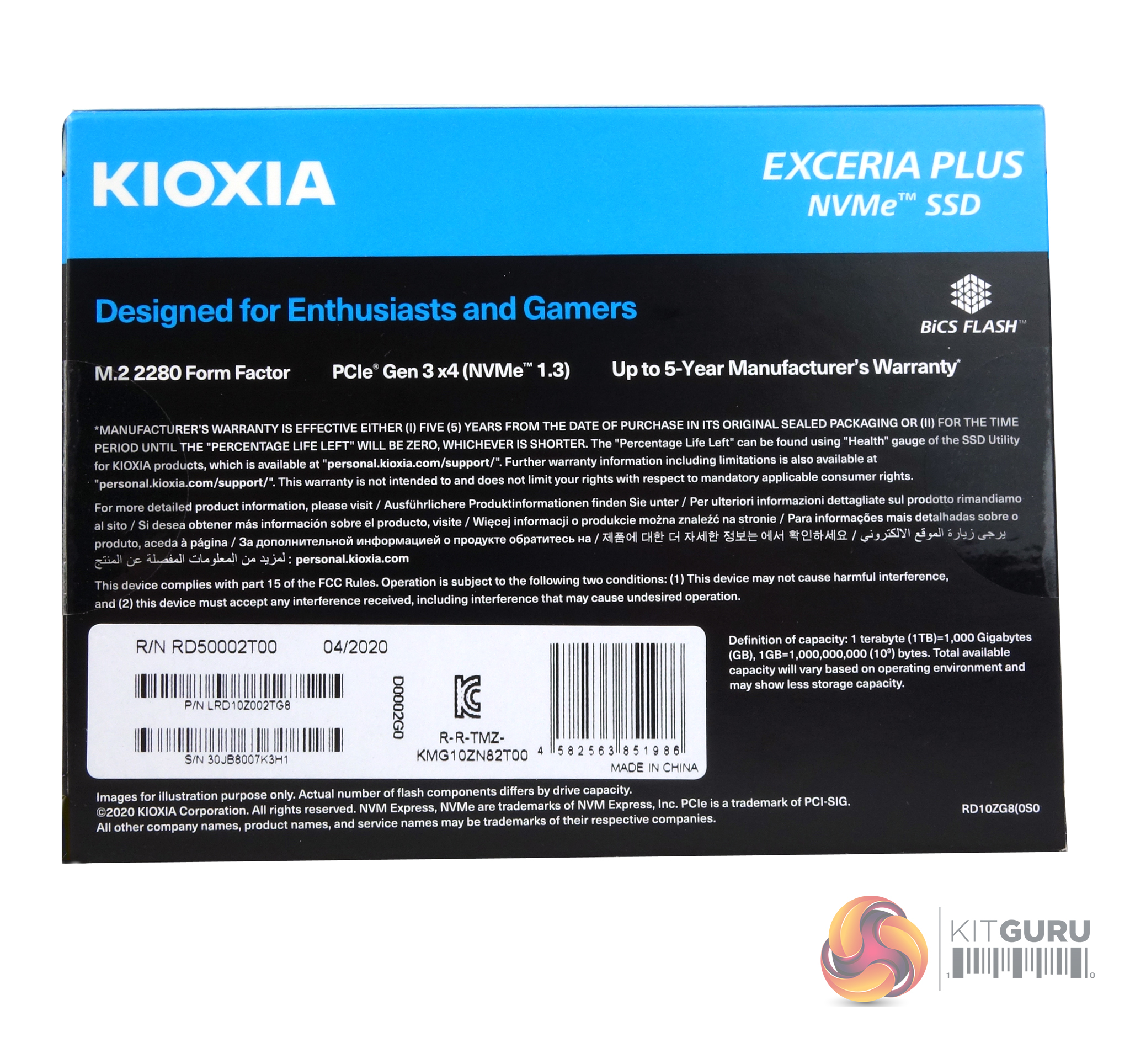 The Exceria Plus comes in a compact box with an image of the drive on the front, along with a sticker displaying the capacity of the drive. The rear of the box has a description of the drive’s form factor, the fact it uses BiCS Flash, a PCIe Gen 3 x4 interface and has a 5-year warranty.