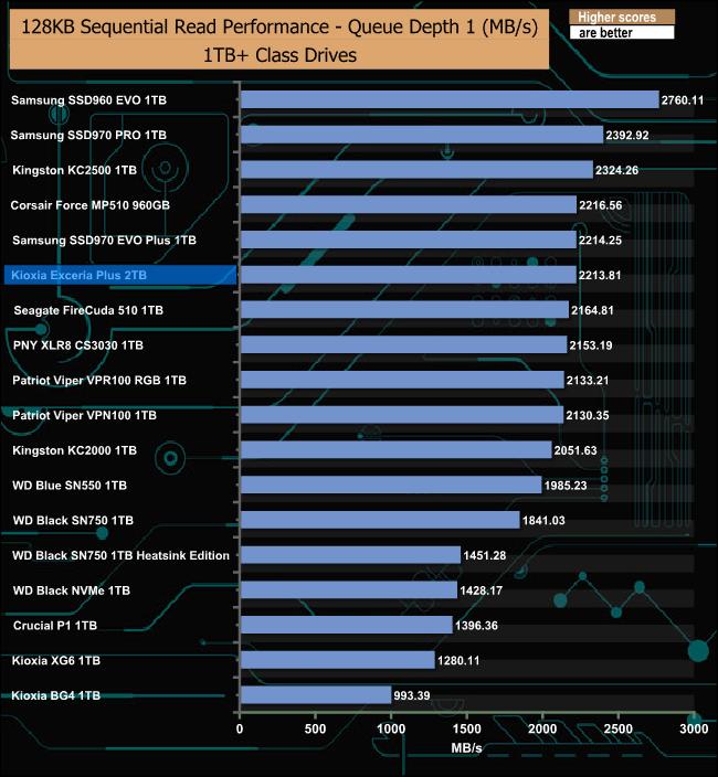 At a queue depth of 1, the Kioxia Exceria Plus is the fastest PCIe Gen 3 drive we have seen to date. As the queue depth deepens the drive does begin to fall back amongst its competitors but does recover to sit in second place in our results chart at a QD of 32.