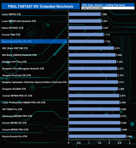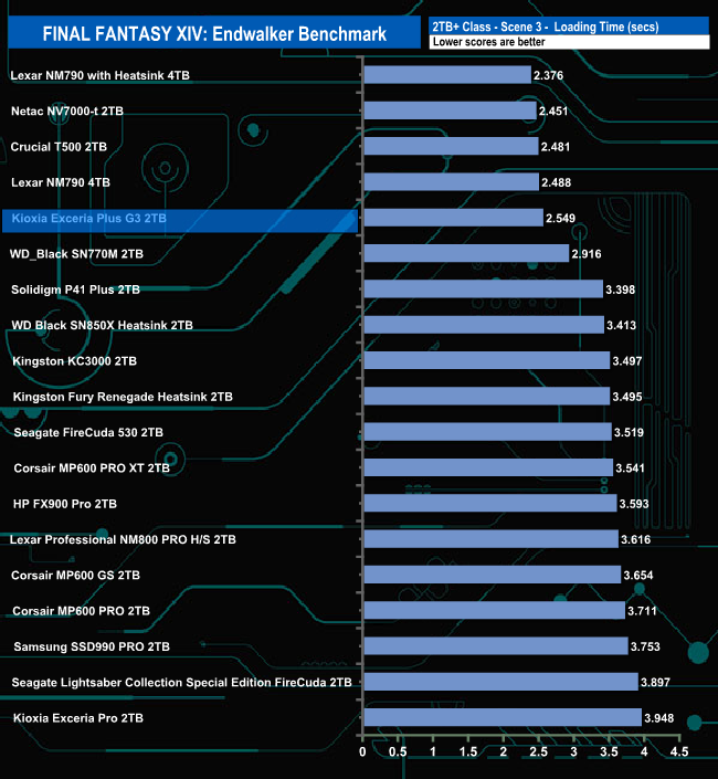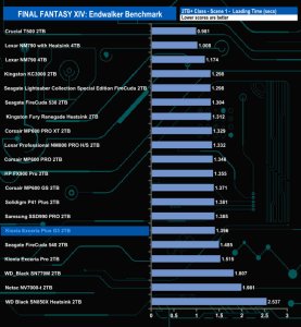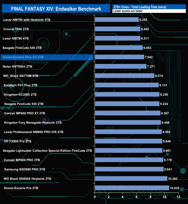 The 2TB Exceria Plus G3 handles the Final Fantasy XIV Endwalker Official Benchmark pretty well. It sits comfortably inside the top 10 for all but one of the tests ending up in fifth place on the Total Loading Time chart.